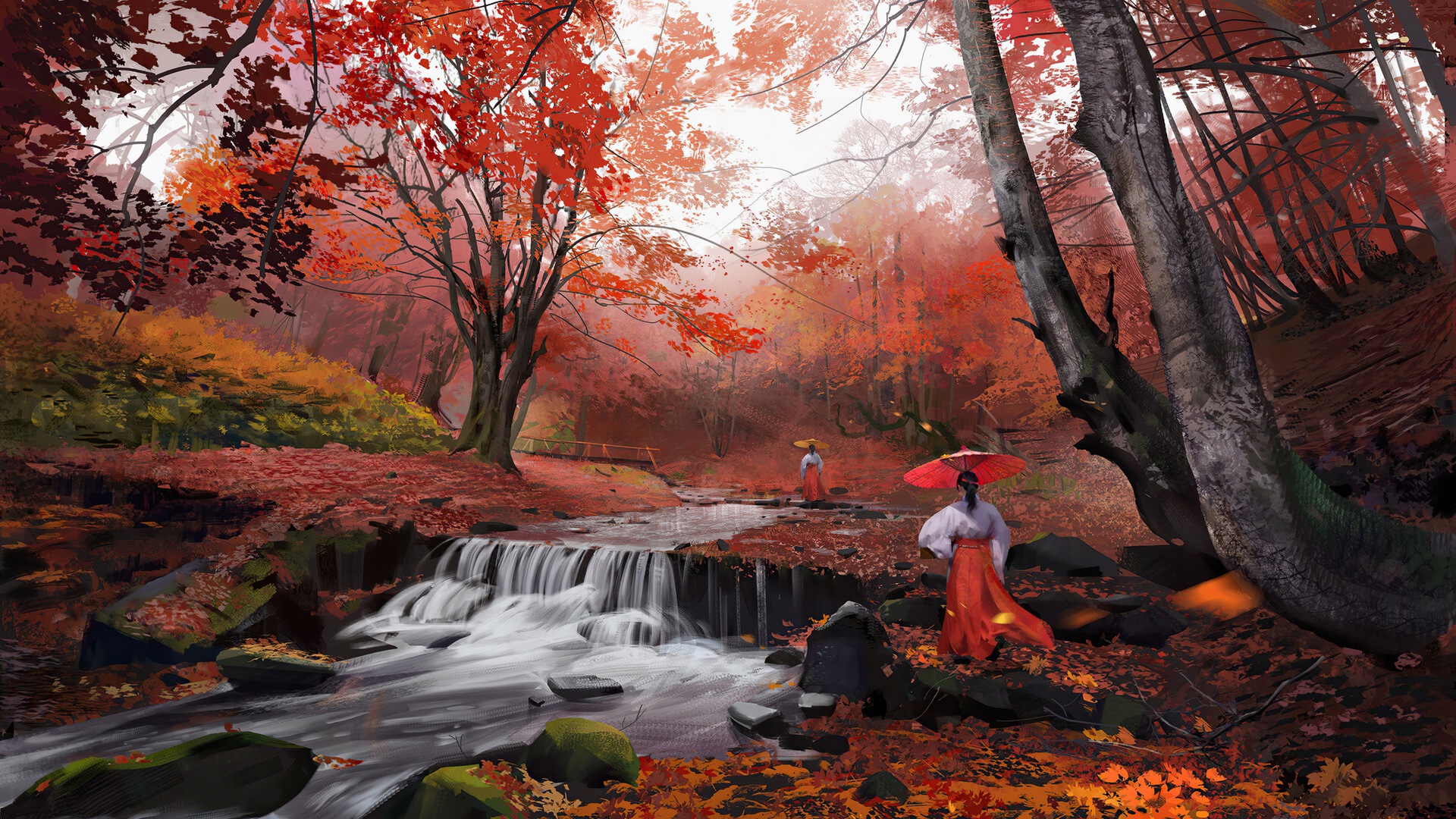 शरद ऋतु 4के में प्राचीन एशियाई लड़कियों सुबह की सैर