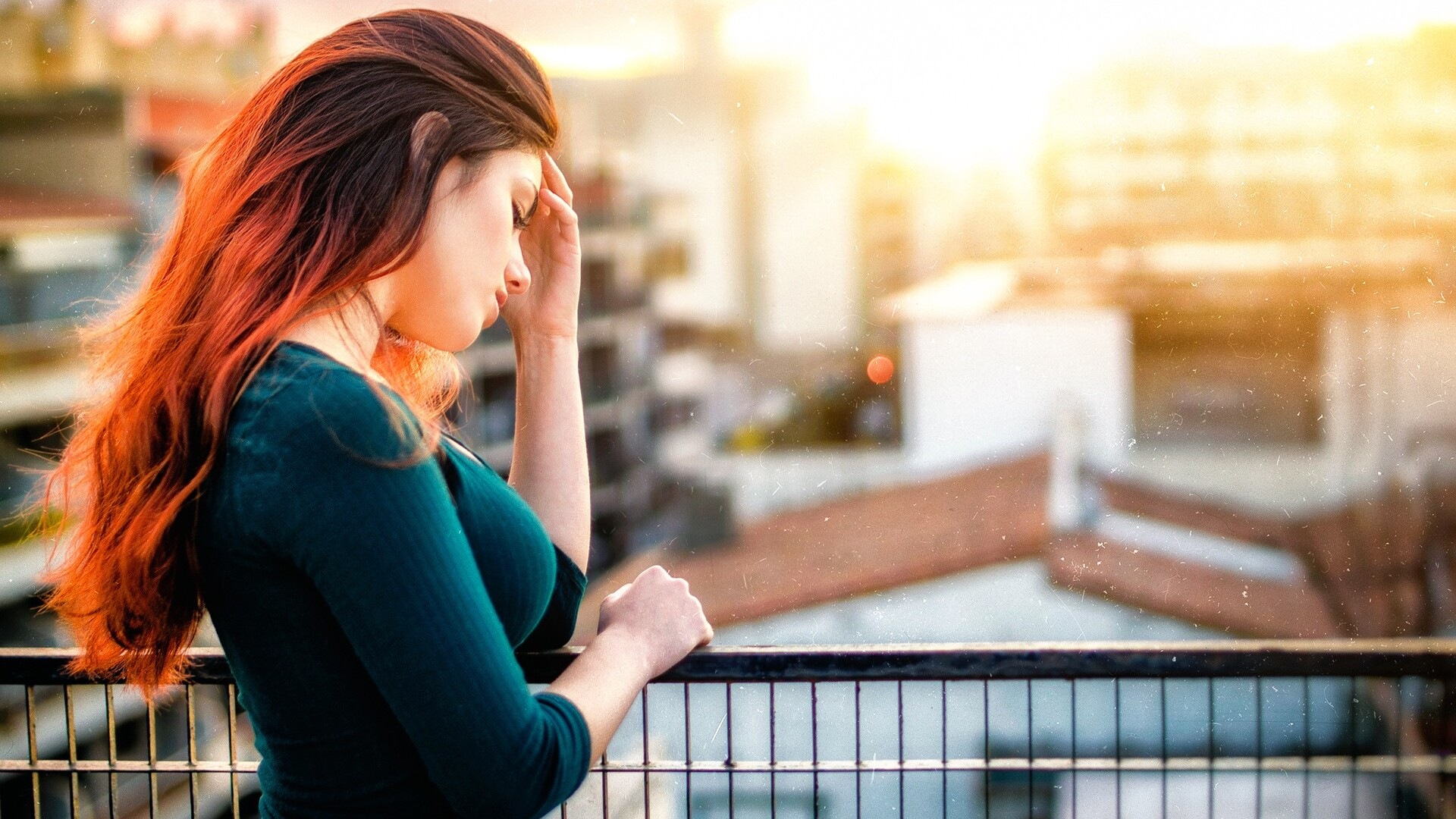 लाल सिर मॉडल में खड़े बालकोनी