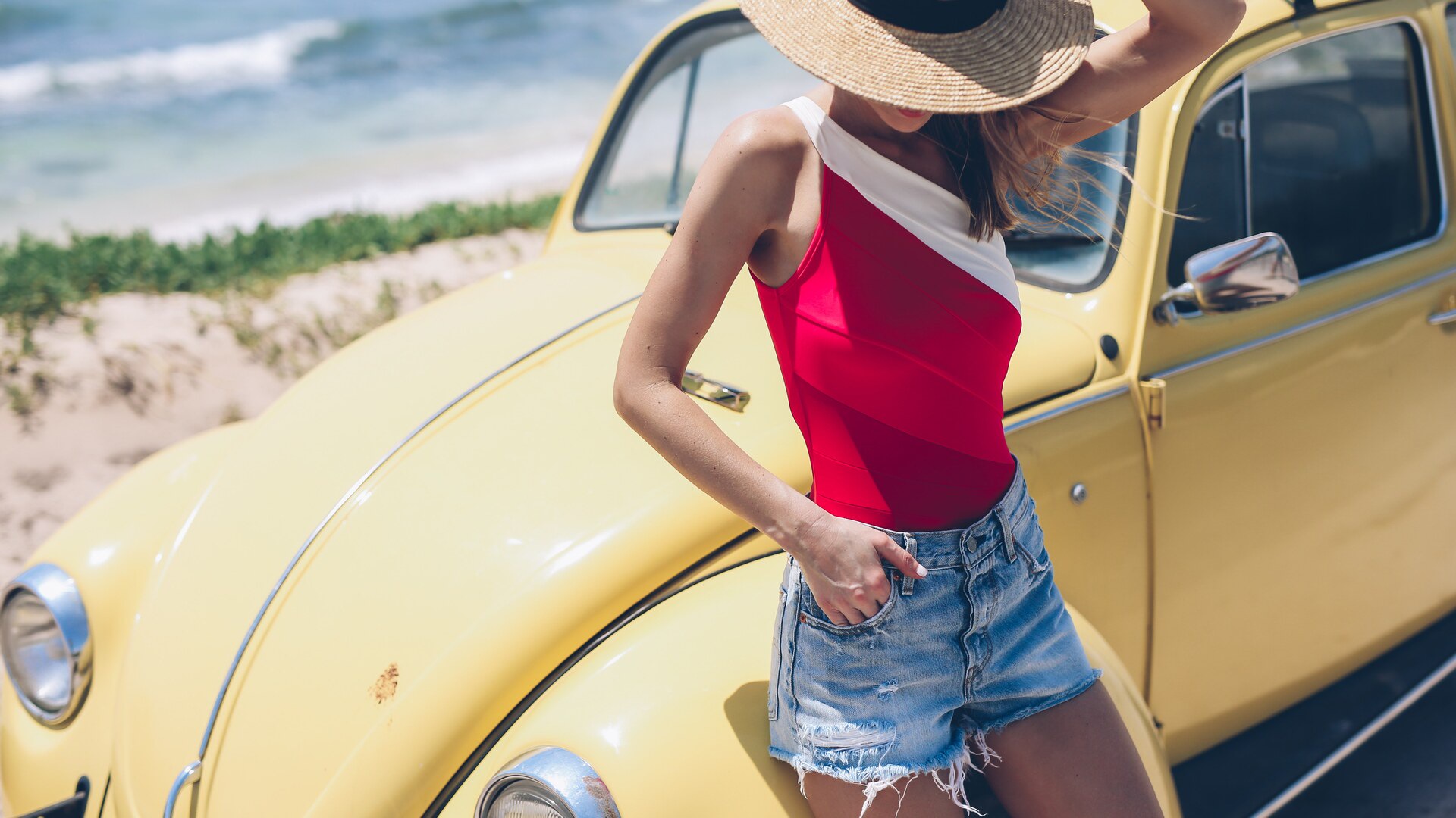 पीले रंग की कार टोपी के साथ ग्रीष्मकालीन लड़की