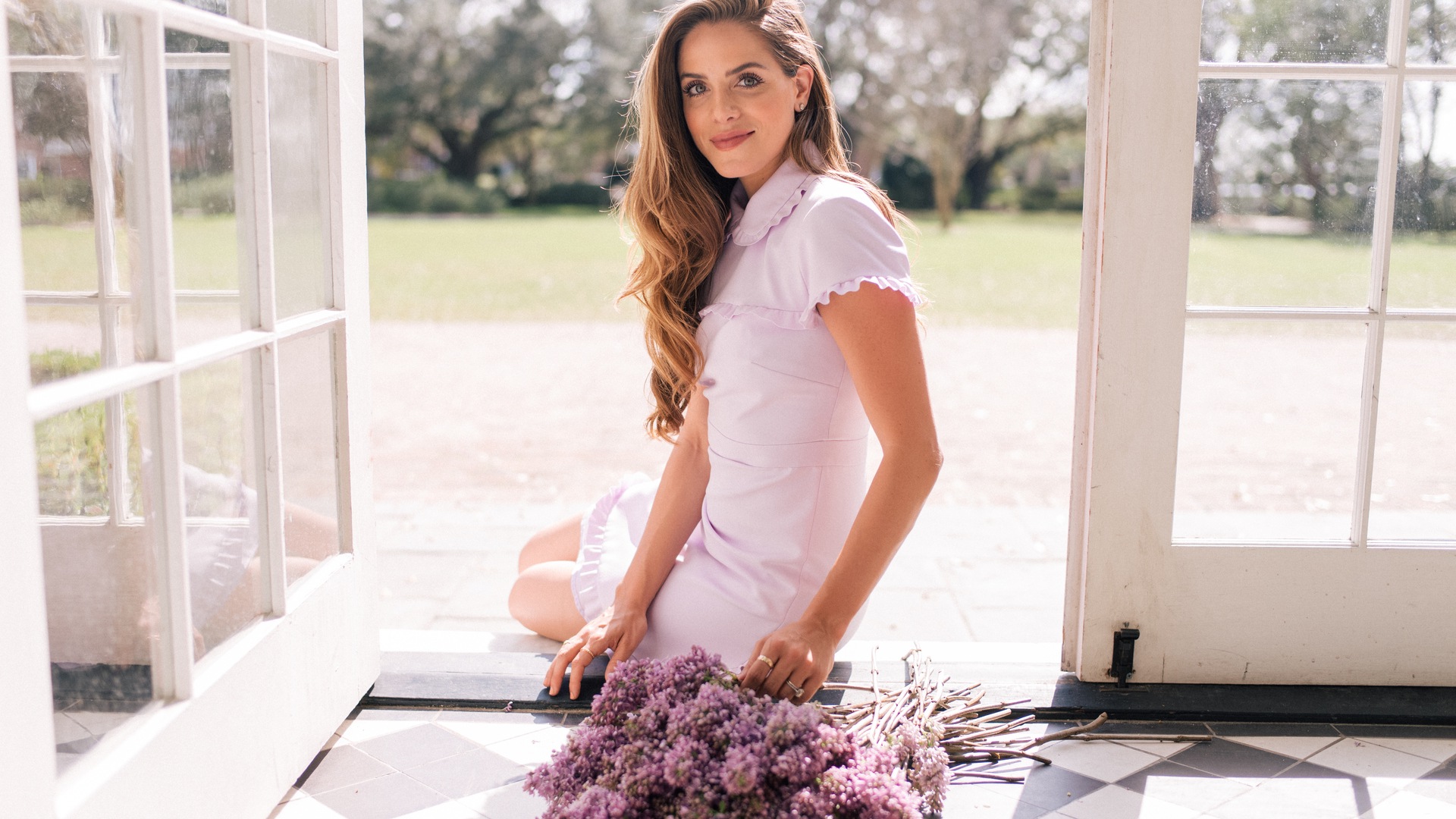 फूलों के साथ दरवाजे पर बैठी महिलाएं