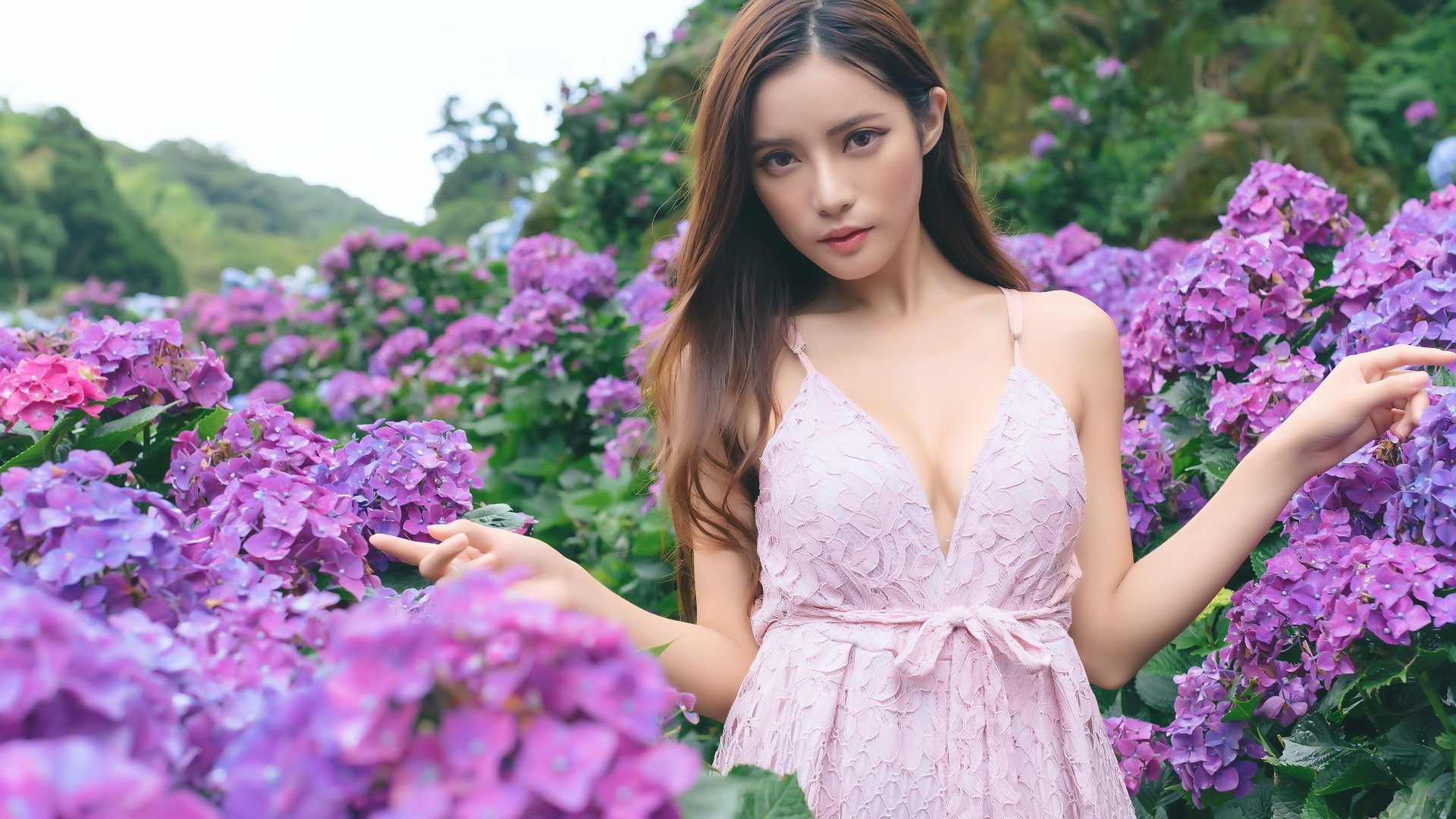 बैंगनी फूल क्षेत्र में एशियाई लड़की